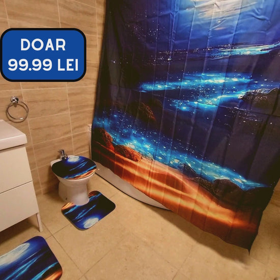 Setul pentru baie este completat de o perdea de duș, covorașe pentru podea și o husă pentru toaletă, oferind o soluție practică și elegantă pentru amenajarea băii dvs.